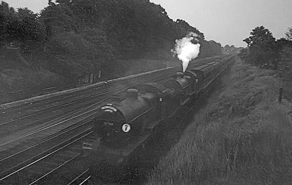 My last photo of these wonderful 4-4-0s was very late on the evening of June 11th 1961, the last day of main line steam in Kent. The Brownie 127 just could not have been expected to produce any image at all in such dull lighting conditions. But some vague image is there, and a lot of work with PhotoShop Elements just about captures the moment! As D1 Class 4-4-0 31749 doubleheads L1 Class 4-4-0 31786 on an up special train near Bromley South on June 11th 1961. | ||