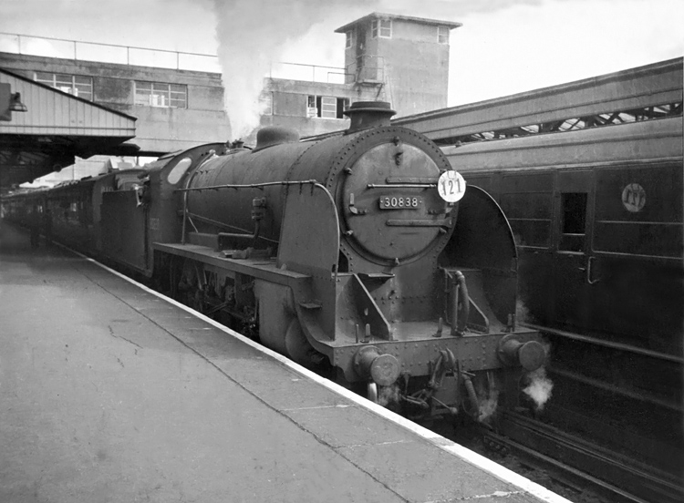 Maunsell S15 class 4-6-0 number 30838 on a down Basingstoke local train next to a Portsmouth line train of 4 CORS at Woking in 1962-1963.