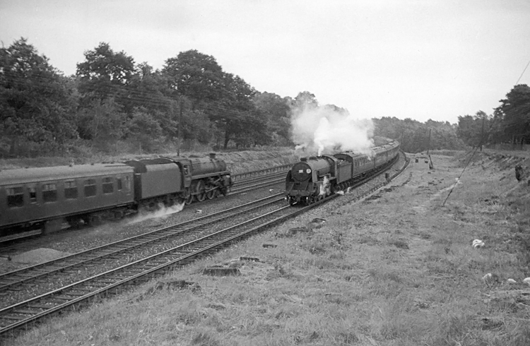 Maunsell S15 class 4-6-0 number 30835 on a down Basingstoke local train meeting BR Standard 5 class 4-6-0 number 73085 on an up passenger train, (due Waterloo 16.50), between Milepost 31 and Pirbight Junction on 11th August 1962.