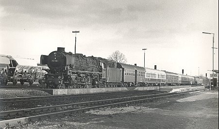 A cold February day in 1974 saw 012 100-4 on shed at Rheine Depot. The big three cylinder, oil fired pacific still had more than a year's hard work in normal service to do. And that included the summer timetable with it's express passenger trains up the main line from Rheine to Emden and Norddeich Mole. I travelled behind the loco just once that year, on the 13th July when I caught train E1638 from Leer to Rheine. My notes show that the schedule was very easy, and without any fast speeds the train was running early or on time all the way! Photos from Jürgen Rech |
