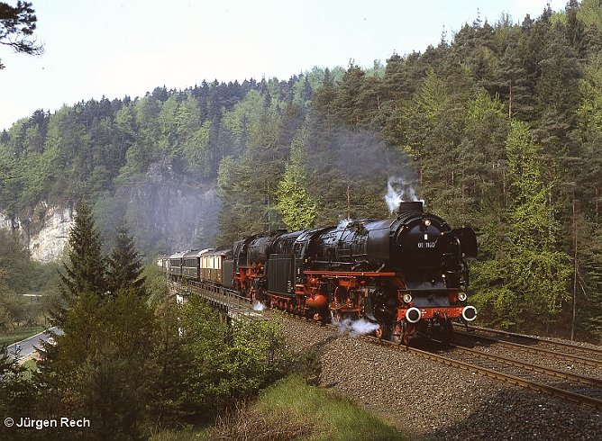 01 1100 hauling a DB Museum special, Nürnberg - Lauda - Frankfurt, taken April 1990 near by Kollenberg (between Wertheim and Miltenberg). Photo by Jürgen Rech.